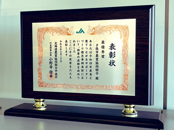 🎉最優秀賞🎉 「食と農でつながるサポーターづくり」 Twitter•NFTを利用し強いファンを獲得した事が受賞ポイント この賞は皆さんの代表で受け取っただけで、フォロワーの皆さんと一緒に受賞したものだと心から思ってます😌 いつも応援ありがとね📣 楯はJA本部に飾りました😊 #10Pで夕張メロン部員