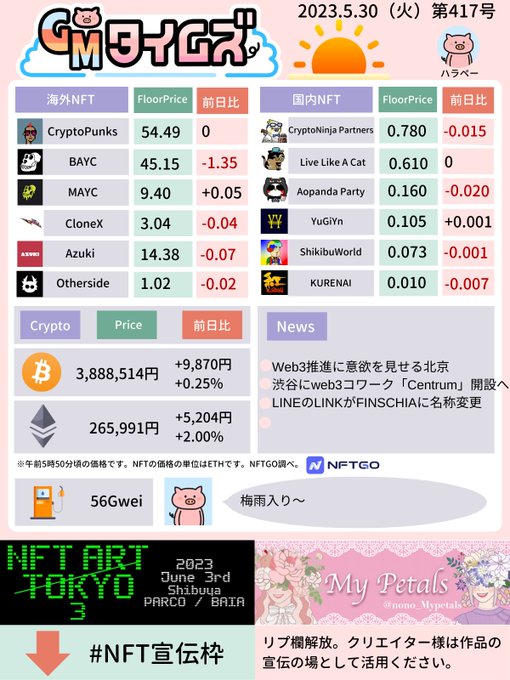 【GMタイムズ 第417号】 仮想通貨・NFTのフロアプライスをまとめました。朝の情報収集にご活用ください。リプ欄を解放します。あなたのNFT作品やWeb3サービスの宣伝の場として自由にご利用OKです。#NFT宣伝枠