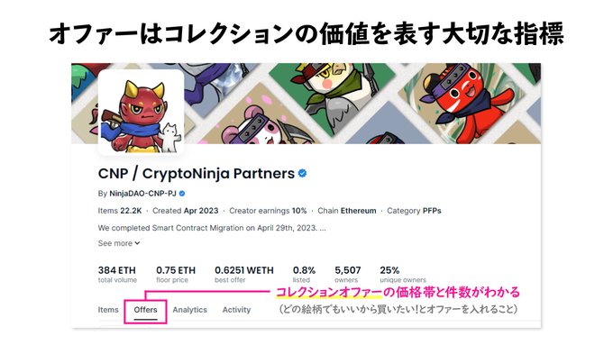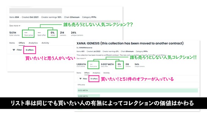 🔰NFT講座🔰 コレクションの価値や人気度をあらわす1つの指標である『オファー』についてまとめました‼️ 【オファーページ】 ▪️価格帯 ▪️件数 ▪️入札者の人数 👆どのくらいの人がいくらで買いたいと思っているかがわかる 【リスト率が低い】 ▪️人気コレクションとはかぎらない…