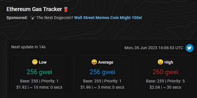 ETH速報:バイナンスがSECに訴えられたことでETH価格が下落、結果としてイーサリアムのガス代が一気に10倍となり260Gwei前後を推移。DeFiのマージンやレンディングのデフォルト注意⚠ #イーサリアム