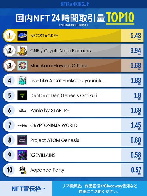 gm☀️国内NFTランキングを更新しました(11位以下はサイトをご確認ください) ✅リプ欄は作品宣伝やGiveawayの告知など自由にご活用ください。