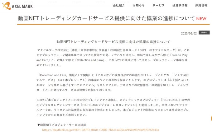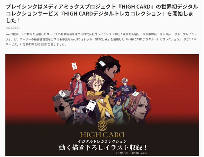 ã¢ã¯ã»ã«ããŒã¯/ã¹ãé«ðð ã¢ãã¡ãªã©ã®æ åäœåIPã®åç»ãNFTãã¬ãŒãã£ã³ã°ã«ãŒããšããŠçºè¡ãããµãŒãã¹ã®æäŸ äžçåããžã¿ã«ã³ã¬ã¯ã·ã§ã³ãµãŒãã¹ãHIGH