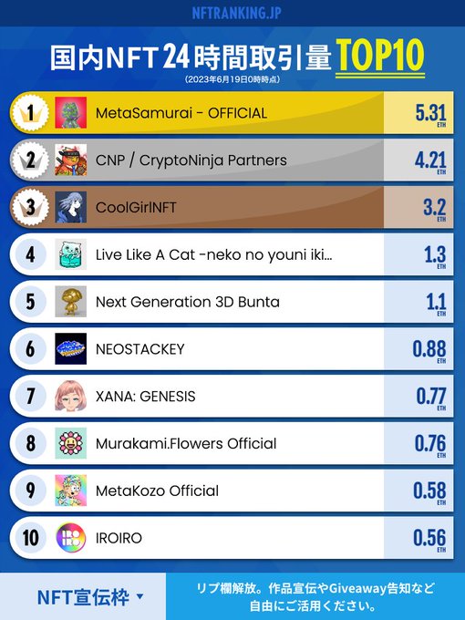 gm☀️国内NFTランキングを更新しました(11位以下はサイトをご確認ください) ✅リプ欄は作品宣伝やGiveawayの告知など自由にご活用ください。