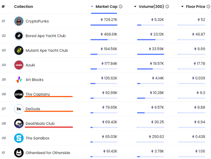 30日間のNFTランキングをみていたら新顔がちらほら CapntainzとDeGodsがランクアップ、ENSやOtherSideがダウン。世代交代を感じる👀 驚きなのはバンドAvenged