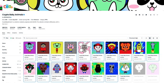 999点のコレクションのCryptoBabyAnimals あと17点フロアから購入されたら5.5ETHになります。 リスト数は18点のみ。 このコレクションはブソンの最初のNFTプロジェクト。 ミントサイトではなく全て手売りで販売しました。 まだ1つも持ってない方はどうぞお待ちしています