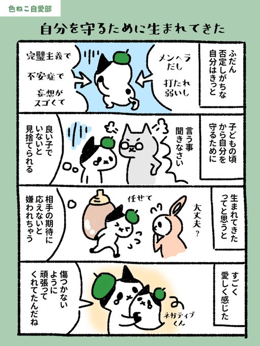 gm☀今日は #色ねこ自愛部 4コマ更新! 私の中には色んな自分がいて、いつも否定しがち。 でもそんな自分たちって「自分を守るために生まれた性質なんだろうな」って思うと、「愛しいし可愛いな」って思うようになりました。どんな自分もOKですね! 今日も楽しい1日にしましょ~🌈 #NFTs