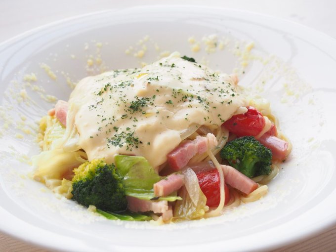 春野菜と厚切りベーコンのアーリオオリオ〜スモーク風味のチーズソース〜 キャベツ・ブロッコリー・ミニトマト・オニオン、厚切りベーコンを使用したオイルパスタです。 スモーク香るチーズソースとご一緒にどうぞ 6/19㈪までのご提供となります。 #NFT