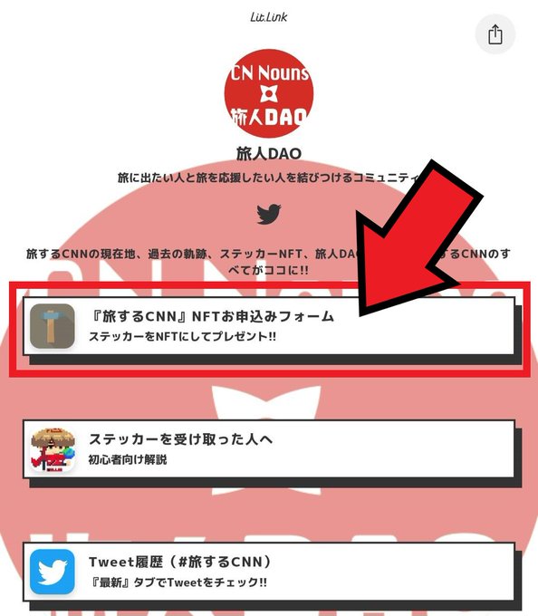 #旅するCNN 拡散お願いします 旅するCNNステッカーをお持ちの方、NFTの申請をお忘れではありませんか? ステッカーのNFTは、Tweetしたあとに【『旅するCNN』NFTお申込みフォーム】からの申請が必要です。 https://t