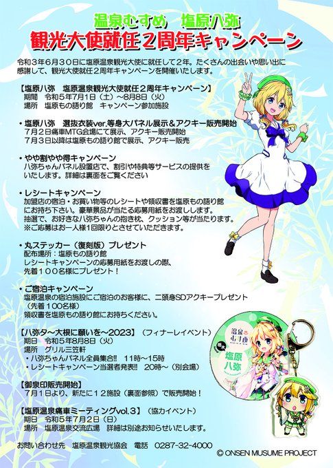 さあ、明日からの塩原温泉はまさに「八弥ちゃん月間」です‼ 1日から盛りだくさんな観光大使2周年記念キャンペーン、田んぼアート、各施設での御泉印販売スタート。 2日は痛車MTG、選抜衣装と桜の妖精パネルの公開&