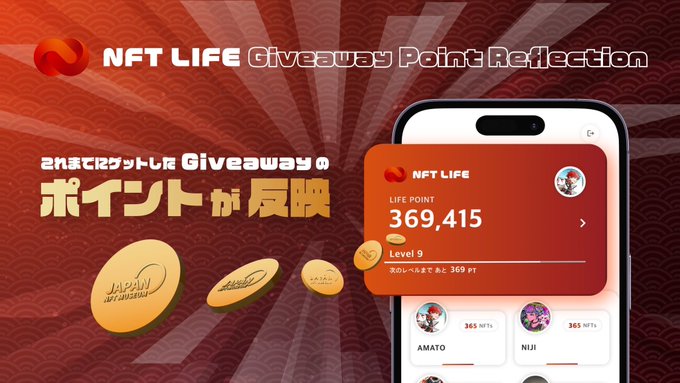 ついにGIVEAWAYポイントが反映🎉🎉🎉 NFTの合計保有日数も全アカウント計算中🌟 最高のアプリアップデートをお楽しみに🚀🔥 GIVEAWAY