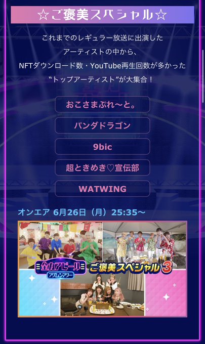 皆さまの応援のお陰でTBSテレビ『全力アピールアダムシアター』【ご褒美スペシャル3】に出演させていただく事になりました📺 NFTのダウンロードやYoutubeの再生ありがとうございました‼️ 放送は6/26(月)
