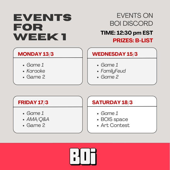 ANNOUNCEMENT ๐ฃ Week1 Events for ๐ ฑ๏ธois Join @officialboinft