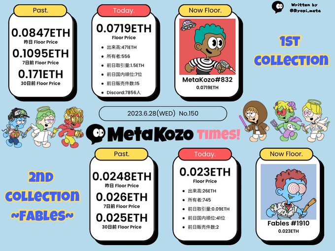 MetaKozo Times! No.150 2023.6.28(WED) MetaKozoの最新情報を毎日発信中✌️ ぜひ、君もにょーんずになろう🚀 🔻リプ欄で語ろう📲 「今話題のNFTは宗教じゃないかという意見についてどう思いますか??」 #MetaKozo #MetaKozoTimes #TeamFables