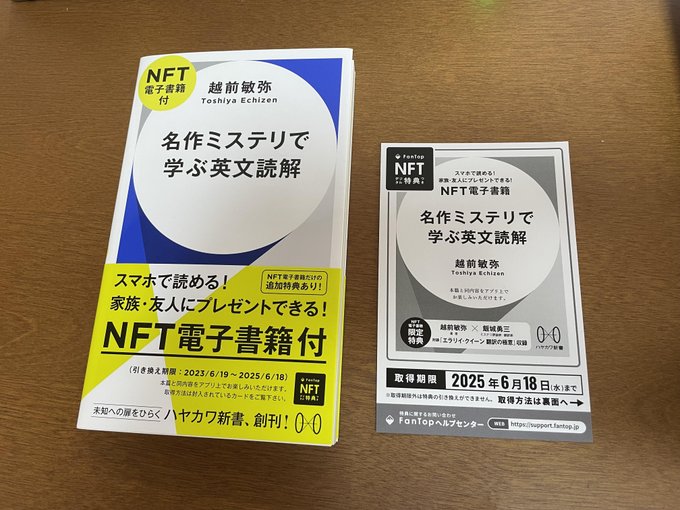 NFT電子書籍付版については、説明がむずかしいのですが、EQFCのクイーン談話室に飯城勇三さんが6月10日付で簡潔にまとめていらっしゃって、わかりやすい。一点付け加えると、転売時に著者や版元にも分配金がはいるので、これが広まれば著者や訳者が生き残る道が開けます。 https://t