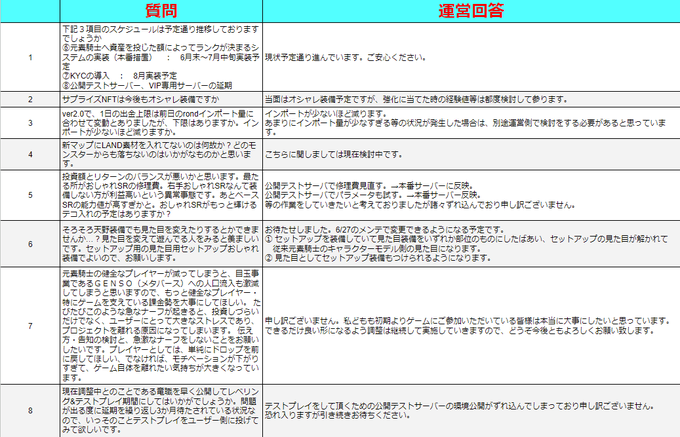 Q&Aが更新されました✨ 【重要箇所を要約】 ✅サプライズNFT当面オシャレ装備、expは都度検討 ✅天野装備6/27メンテで見た目変更実装 ✅ナーフ、ドロップ調整等はその都度検討。 ✅LRオシャレも個別投資対象とみなしランク制度に反映。 などなど #Gensokishi #元素騎士 #花火亭