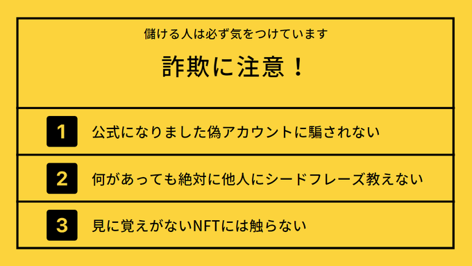 【ここだけの話】NFTで利益を得るための必須条件教えます。 それは『詐欺に遭わないこと』です。 ◆偽のSNSアカウントに注意 ◆シードフレーズは厳重管理