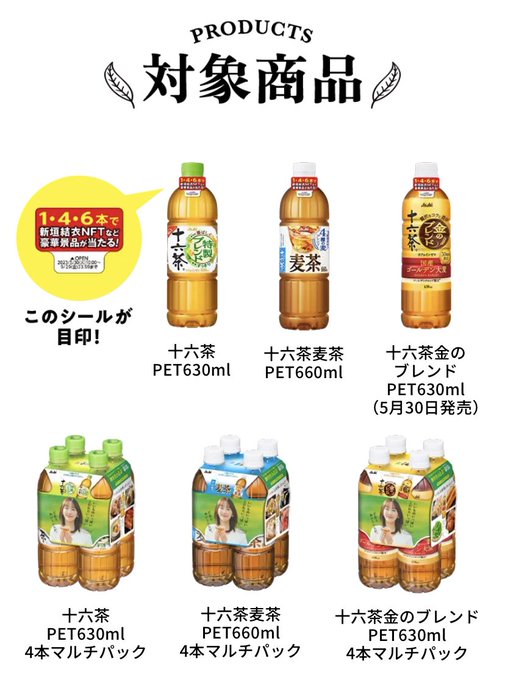 知ってましたか? 意外と身近にNFTは存在します💡 ✅十六茶30周年キャンペーン 新垣結衣 NFT等豪華景品が当たる❗️ 対象商品を購入し、シールポイントを集めて応募するだけ🤝 LINENFTから登場ですよ👌 僕はマルチパックと2本を購入予定です😍 概要はリプ欄の公式HPから確認してみてくださいね👌