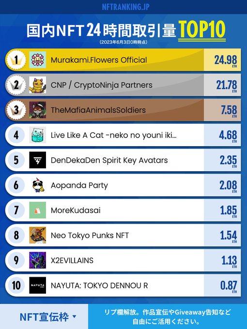 gm☀️国内NFTランキングを更新しました(11位以下はサイトをご確認ください) ✅リプ欄は作品宣伝やGiveawayの告知など自由にご活用ください。