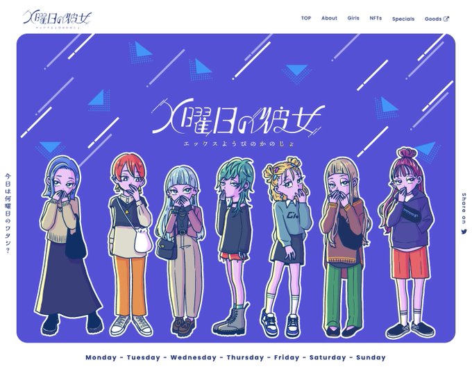 \💃ついに公開🕺/ #x曜日の彼女 の公式WEBサイトができあがりました! コンセプトや彼女たちのプロフィール、グッズ、NFT紹介などをまとめたサイトになります。 コレクションのコンセプトサイトが作ってみたくて、やっとやっとひとつ目標を達成しました! リンクはリプへ