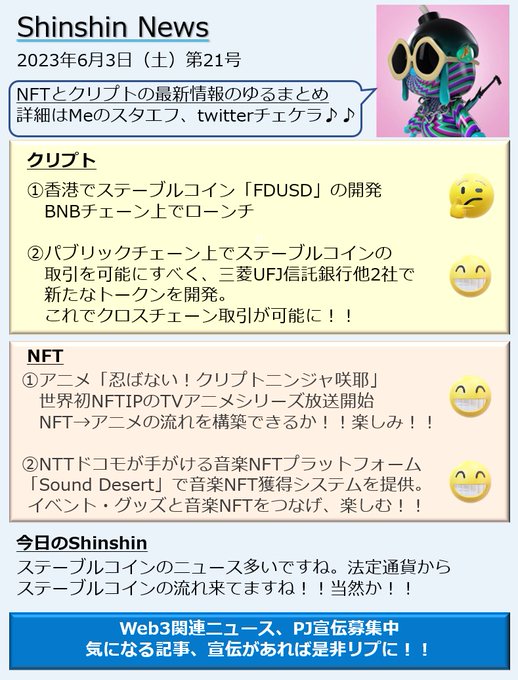 Shinshin News 20230603 注目ニュースはNFT①です。世界初NFTIPのアニメシリーズ化!!世間の反応、今後の動向は要チェック。アニメ化によってNFTのイメージや認知がどのように変化するのか。すごく楽しみです。 #CriptoNinja