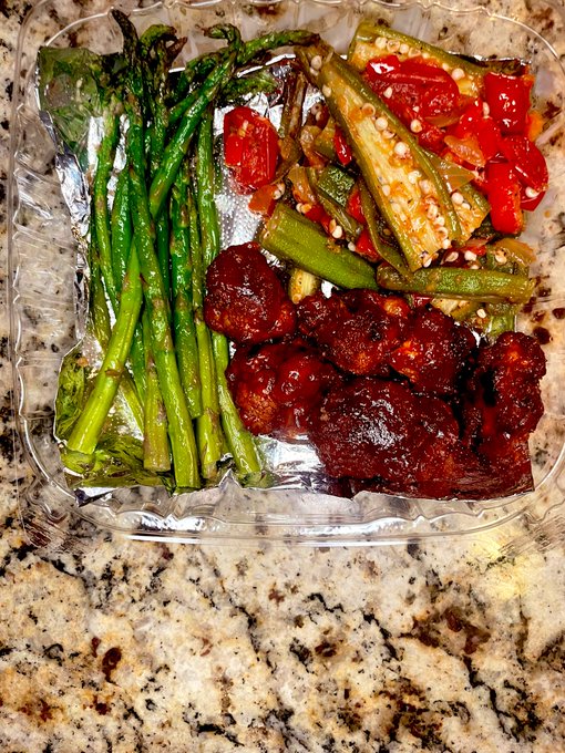 BBQ cauli nuggets paired with okra and tomatoes with