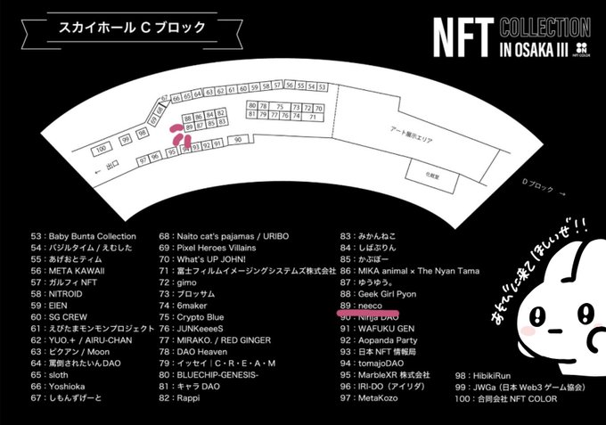Nコレの場所が発表されたぜ!おれは89番のところでもっちりと待っているんだぜ! 保有してるおれのNFTとおなまえを言ってもらえれば300円商品ひとつプレゼントなんだぜ🐰三🐰✨✨ もちもちドキドキなおれたち…ぜひきて欲しいんだぜ〜!!!!!🐰💗💗