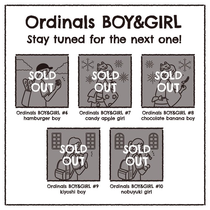 ✨Ordinals BOY&GIRL 瞬殺で完売✨ 第2弾も大変有難いことに瞬殺で完売しました🥳 やっぱきよしとのぶゆきは大人気🤣 2次も4点出てるので見てくださいね〜🥳 応援してくださった皆さま、 本当にありがとうございます😭 第3弾は明後日です! 引き続き制作頑張ります🔥 #Ordinals