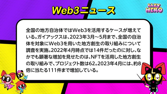 ここ1年で自治体がweb3を活用する事例が急増しているみたいだわ❣️ 特にNFTの活用が多いんだって✨ ふるさと納税やデジタル住民票などで盛り上がってるわよね☺️ NFTだと発行者・保有者それぞれにメリットがあるから、まだよく知らない方はぜひ体験してみてほしいわ🤗