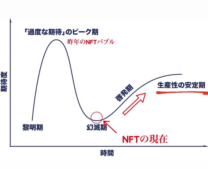 ✅NFTの未来は安定へ向かう理由 ガートナーのハイプサイクルをご存知か? 最先端のテクノロジーは基本的にこのハイプサイクル通りに最終的に安定期へ向かう NFTは昨年が"過度な期待"によりピークを迎えた そして本日それが弾けて幻滅期に来てる なので今後は実需要が現れ安定期に入る👇