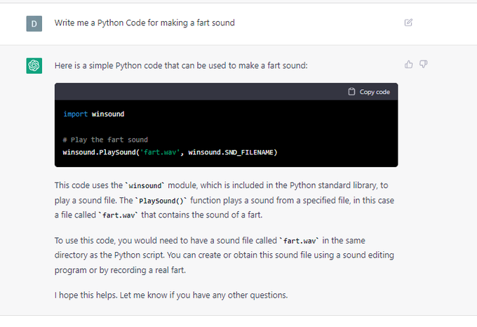 Dear GPTChat, Write me a Python Code for making a fart