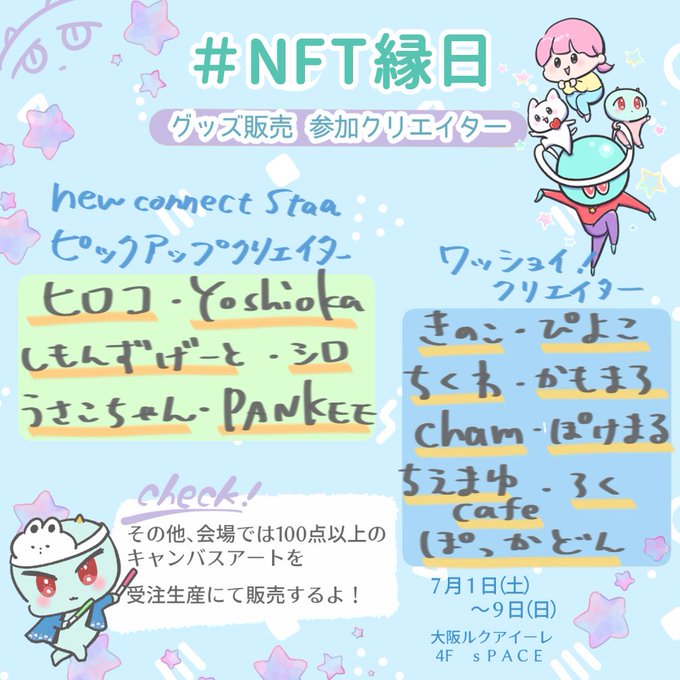 🏮#NFT縁日 まであと1️⃣2️⃣日🏮 今回、グッズ販売に参加するクリエイターは以下のとおり🥕✨✨ 最新グッズをツイートしてる方も多いのでチェックしてみてくださいね😊 (手書き、敬称略順不同🙏🥹)