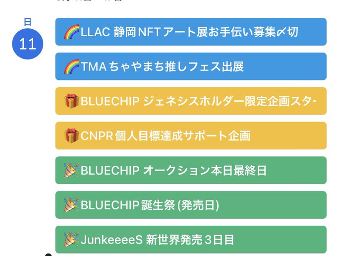 6/11 今日知っておきたいNFTニュース 🌟今日は5PJ🌟 ・LLAC ・TMA ・BLUECHIP ・CNPR ・JUNKeeeeS 詳細はカレンダーに記載しています! (プロフのリンクから飛べるよ😉) 土日はリリースプロジェクトも多く ミント祭り😆✨ ミント報告ツイートをみているだけでも楽しい🥰…