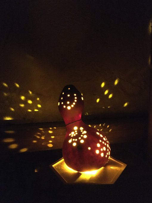 瓢箪ライトDIY。 瓢箪にドリルで穴を開けて、 中に100均のライトを入れて 台座の部分は、100均の小物入れを ひっくり返して台にしました✨ 初めてだけどお気に入りのものが 作れて満足です☺️#合掌 #GASSHO