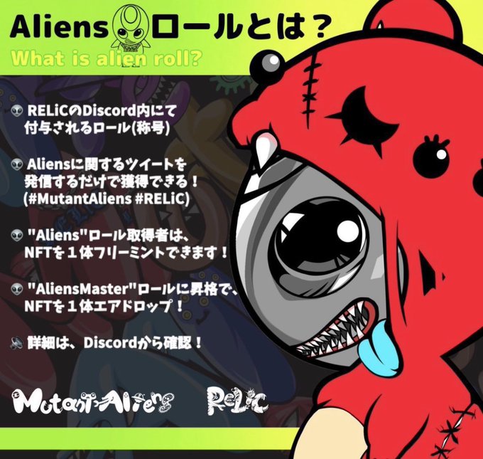 Alienロール取得者は ジェネラティブのNFT一体がフリーミントできます✨ 取得方法はこちらのハッシュタグをつけて3日間で5ツイートほどするだけ✨ #MutantAliens