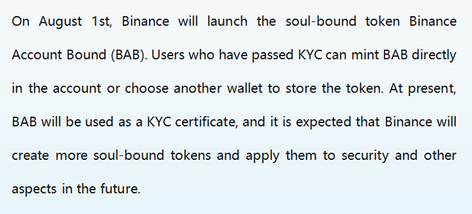 Binance will launch the soul-bound token BAB as a KYC