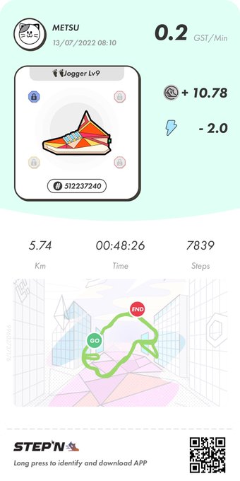 おはようございます。 STEPN36日目です。 獲得=10.78GST 修理=1.64GTS 本日利益=9