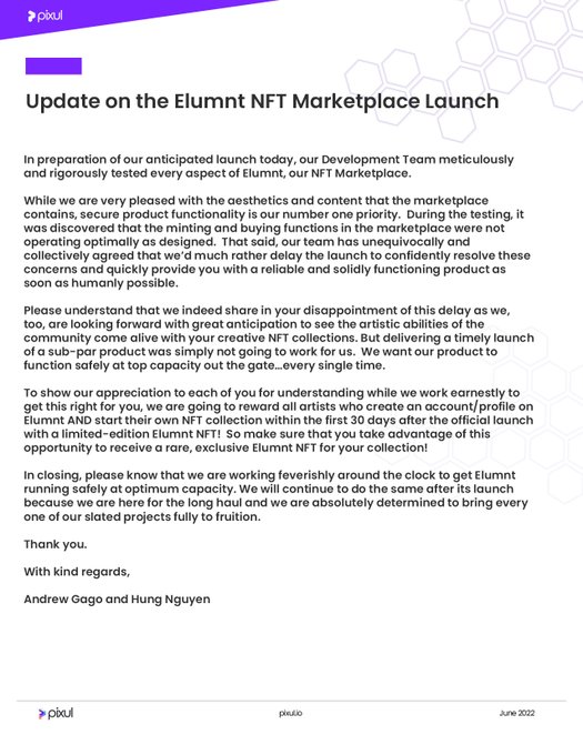 Official Announcement regarding the Elumnt NFT Marketplace