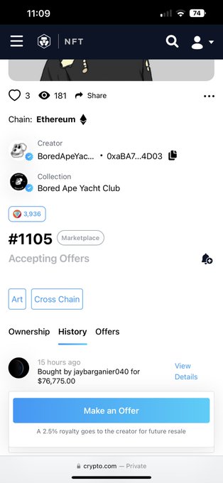 First ever BAYC sale on cdc nft marketplace. Just the