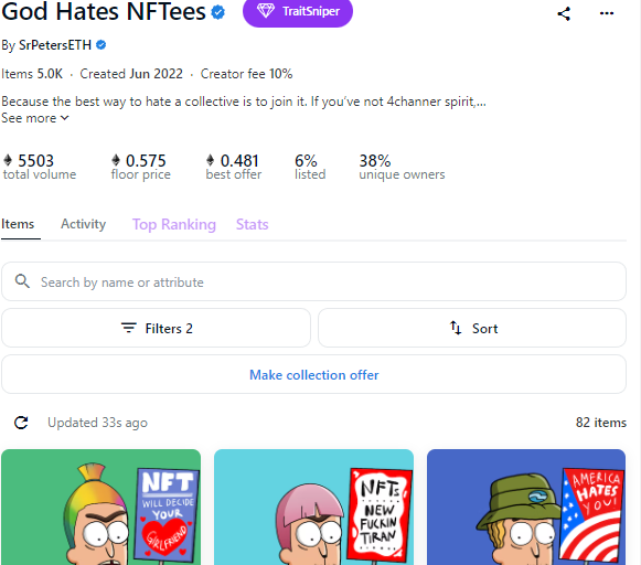 Seems like @GodHatesNFTees had 33 sales today, 82