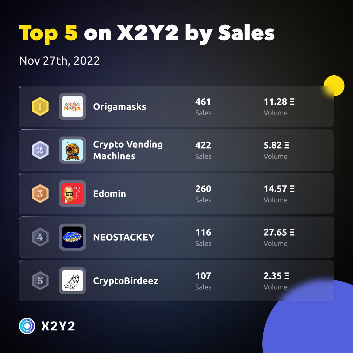 Top 5 projects on #X2Y2 by Sales in the last 24 hours
