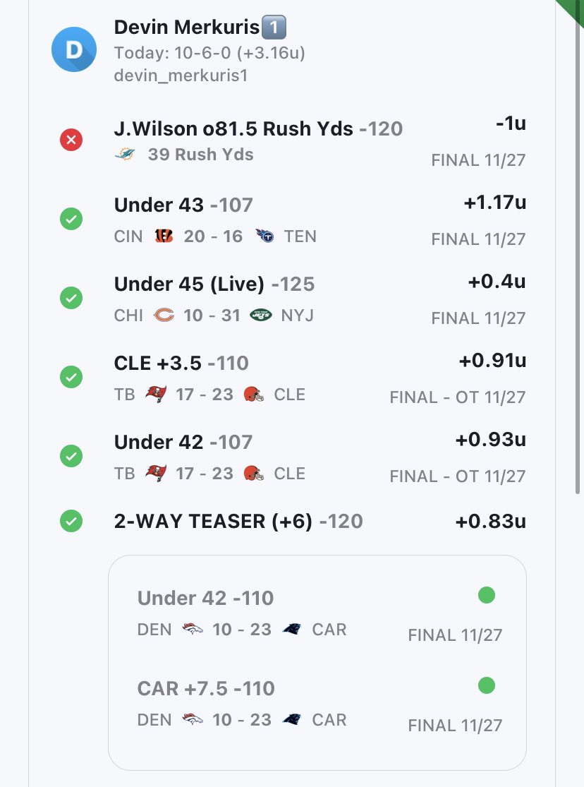 11/27 Recap 10-6 (+3.16u)✅ NFL: 8-2 (+4.38u) CBB: