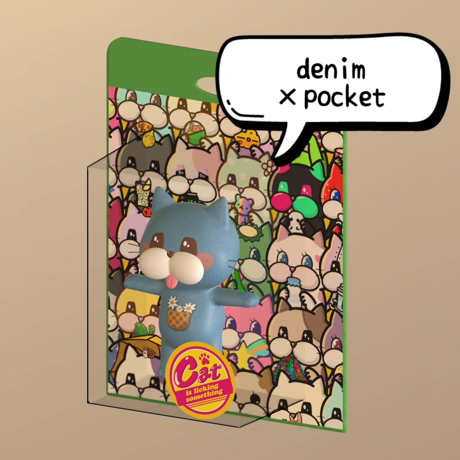 🐾新作情報🐾 ┈┈┈┈┈┈┈ ペロ猫アバター付きパッケージフィギュア 🐾package green 🐾denim×pocket 🐾質感▶︎デニム ┈┈┈┈┈┈┈ 袋とじコンテンツに、メタバースに飾れるglbデータと、アバターとして使えるvrmデータが入っています。 #HEXANFT