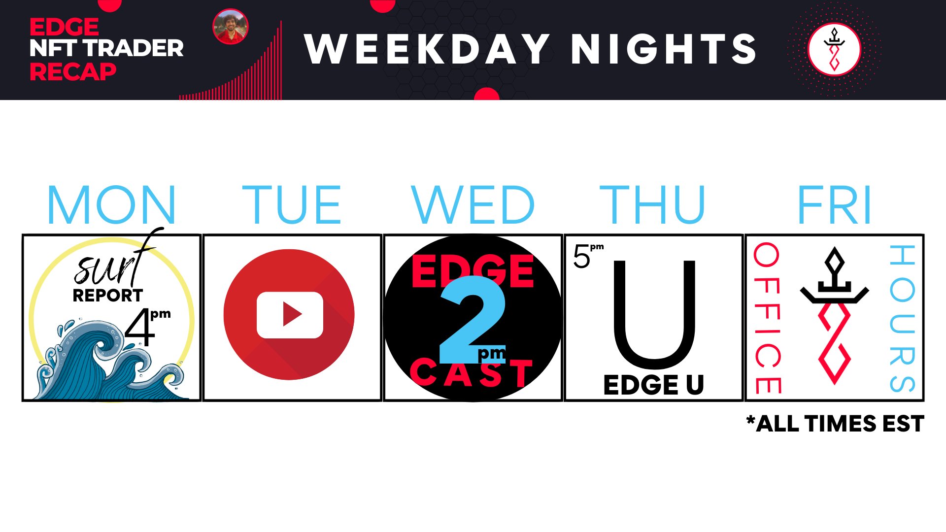 Mon - Surf Report - 4 pm (Twitter) Tue- YT Vid - morning