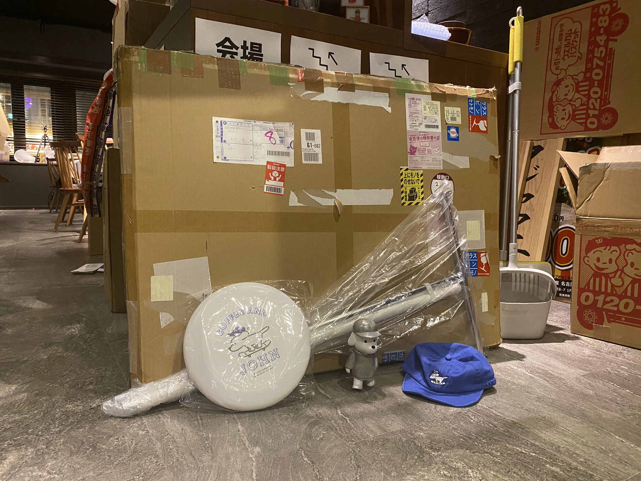 NFT ART TOKYOは、荷物の制限がきびしく、販売するジョングッズが段ボールに入り切らず、キャリーバックを準備せねば!! 何よりこの看板の入った段ボールを手で持って名古屋から渋谷に行かないといけなくて絶望してる😭 雨降ることだけは避けたいので、今からてるてる坊主の量産に入ります💦