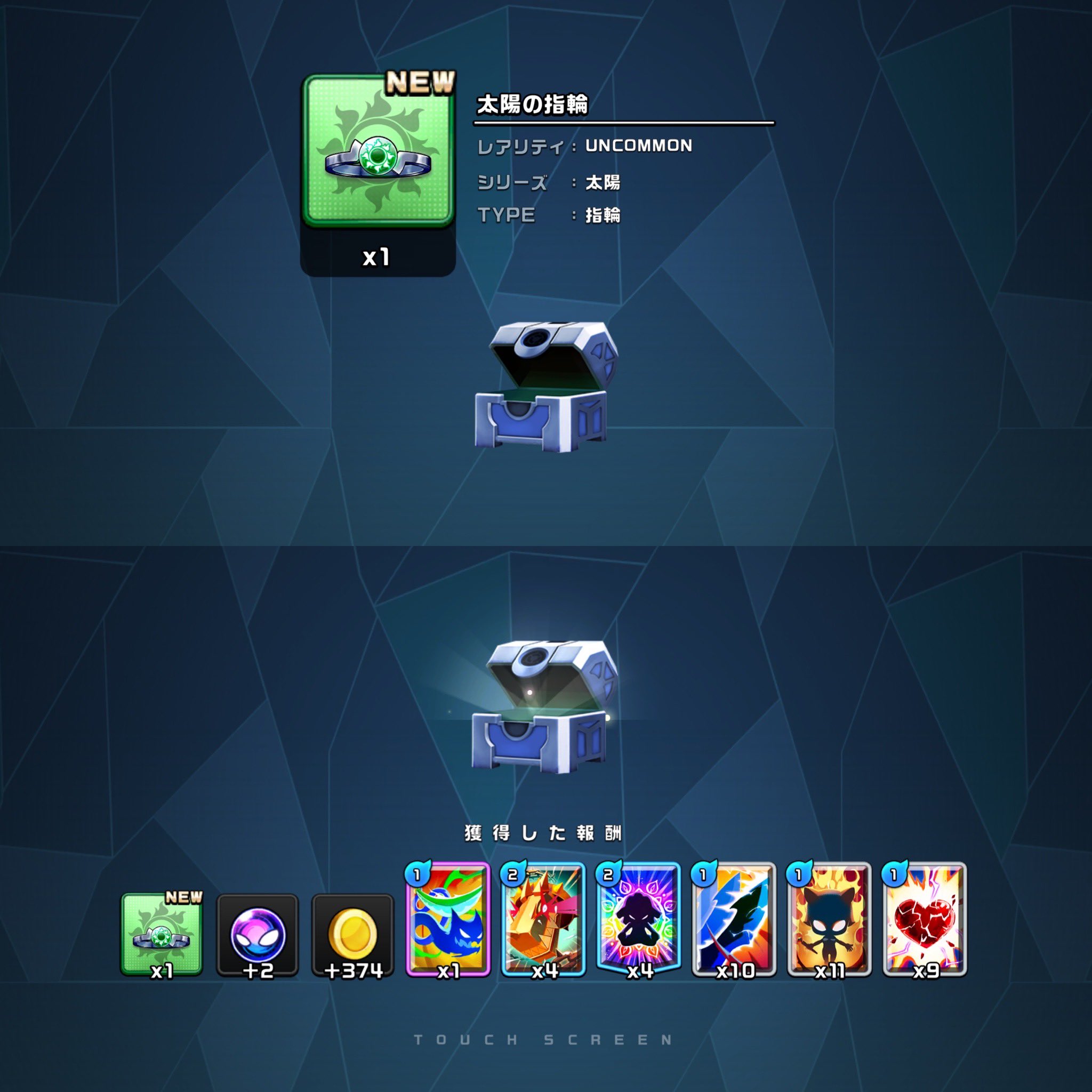 やったァー🙌微課金ユーザー(初心者パック2回, NINJAパック1回, 新カードパック1回の合計7080円)の初チャーム💍 SNSでやたらNFT-BOXやら武器や装備が落ちてるから、30分ほど戦いまくって、Uコインで宝箱を開けまくって、約1200