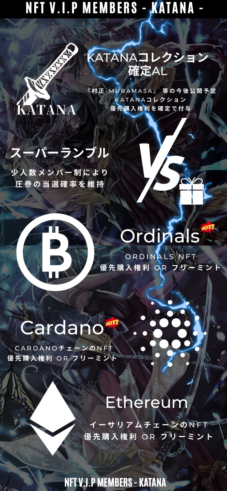 #雷切 #RAIKIRI は 『NFT V.I.P MEMBERS - KATANA -』への入会Passとして そして今後展開する 『KATANAコレクション』のGENESISです。 数日中に申請者様の中から抽選で50名 (予定)にAL当選のInvitationが届きます。 当選されなかった方々にも購入するチャンスはございますのでご安心ください。