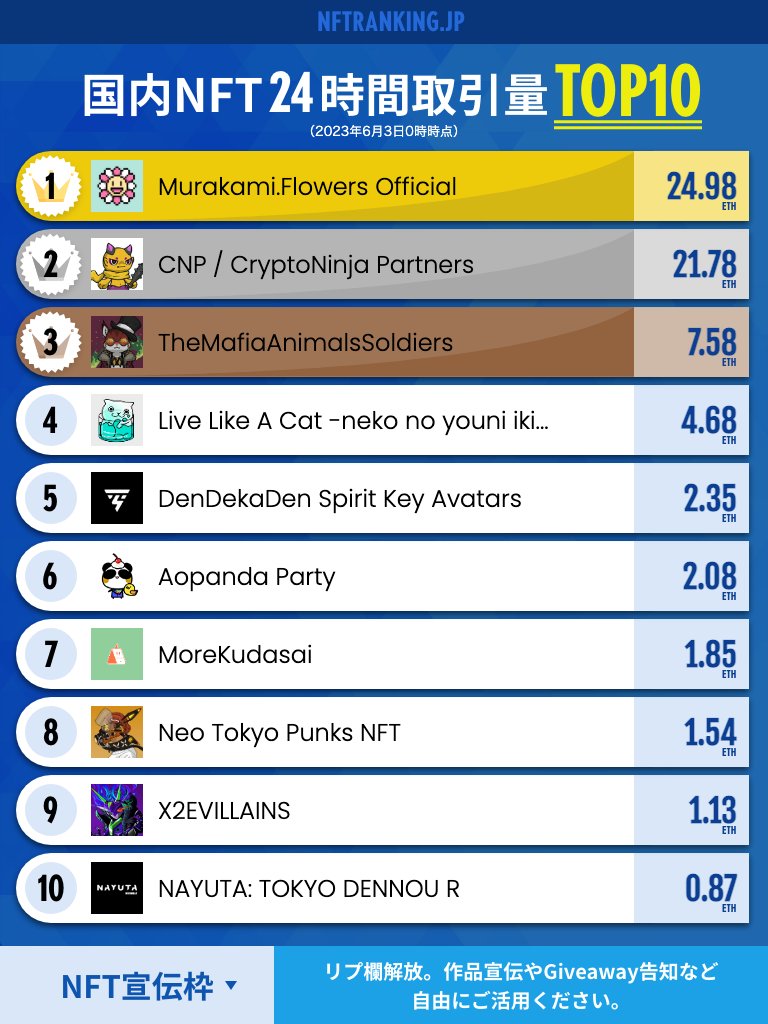 gm☀️国内NFTランキングを更新しました(11位以下はサイトをご確認ください) ✅リプ欄は作品宣伝やGiveawayの告知など自由にご活用ください。