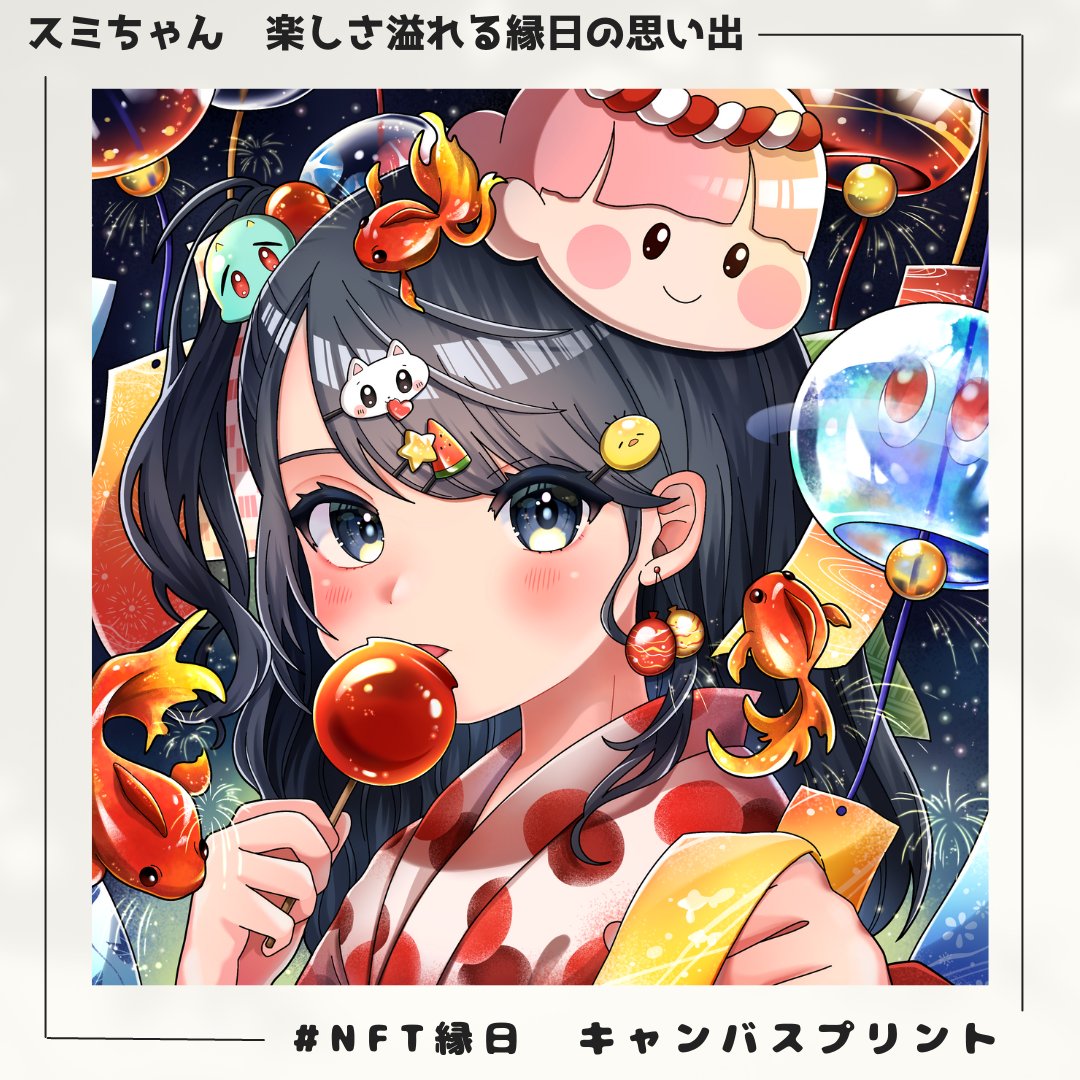 スミちゃんの #NFT縁日 キャンバスプリント展示作品です🥰✨ コネクトマガジン編集部のみんなのキャラに囲まれて、幸せすぎまーす😍💖💖 ぽっかちゃん、どんどんさん、ねこのカジカジちゃん、小鬼のめめちゃん、ひよこのゆきちちゃんを探してね😊✨