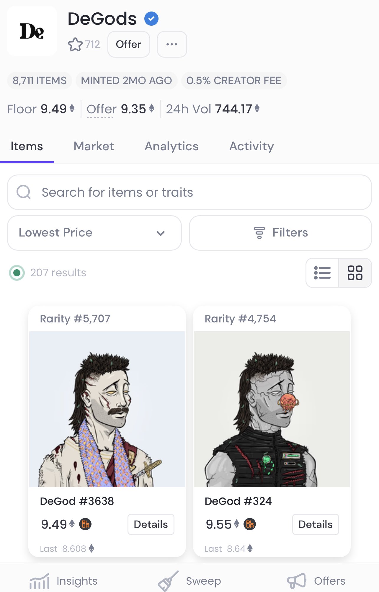 The floor price of DeGods NFT is 9.5 eth The floor