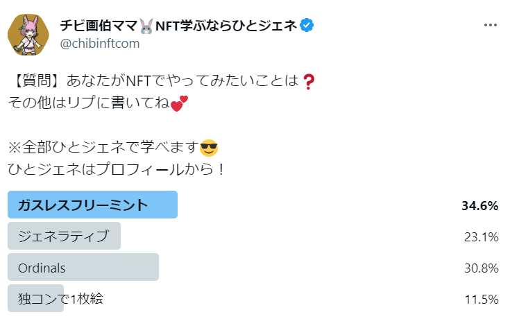 【結果発表】 NFTでやってみたいことアンケート 1⃣位:ガスレスフリーミント 2⃣位:Ordinals 3⃣位:ジェネラティブ 全部ひとジェネに動画教材ある👀 しかもジェネ教材は無料! (Ordinalsはまだ途中です) ガスレスフリミンのやりかたは有料noteにもしています。プロフのlitlinkから飛べます。